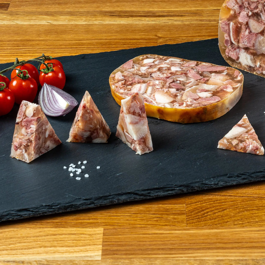 Ingrediente: carne cap de porc, organe, sorici, sare, gelatina, condimente (piper, zahar, usturoi), nitrit de sodiu, acid ascorbic,izoascorbat de sodiu, citrat de sodiu, glutamat monosodic. Produs fiert si afumat. Membrana naturata, necomestibila.